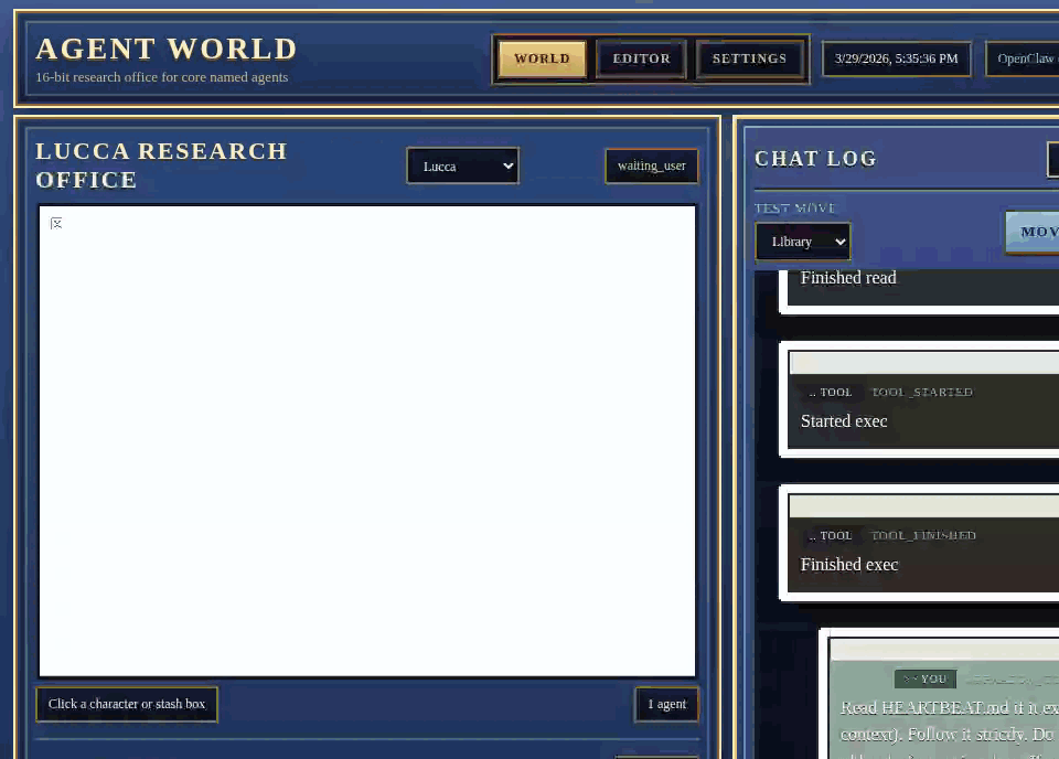Agent World turns OpenClaw session state into a living, 16-bit office. Watch your agents work, move, and respond — in real time.